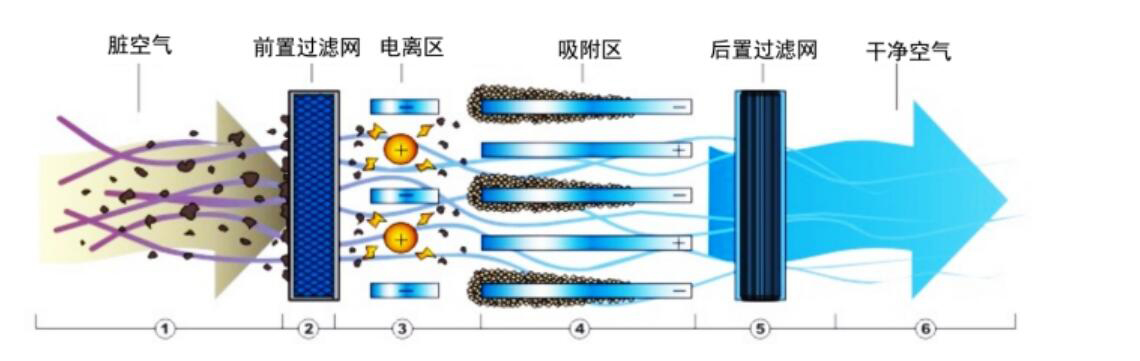该油烟净化器采用二级静电式吸附技术去除细微粒径的碳氢化合物和其他空气中的杂粒。二级式是指电离区与吸附区,每个电离区由一系列钨钢线组成,安装在一系列接地板中间,并通给高压直流电。大气中的微粒在通过电离器的强力静电场时,被电离并带有正或负电荷。每个吸附区有很多数量的平行板组成,通以高压直流电(极性与电离器一致,但电压减半)以形成电场,带电微粒被接地板吸引的同时也受到带电板的驱赶。正因如此,当气流中含有带电微粒时,可以被有效去除。