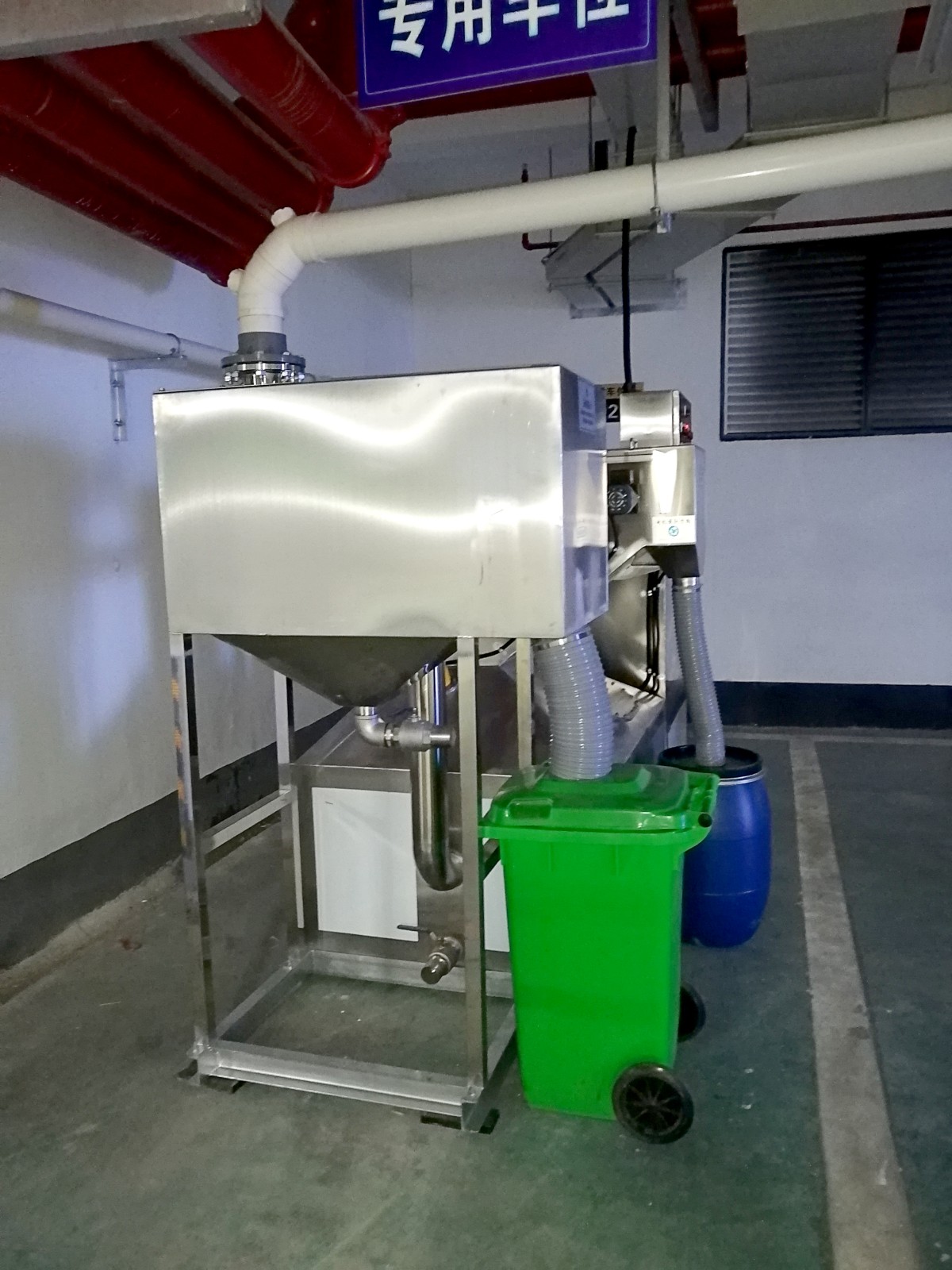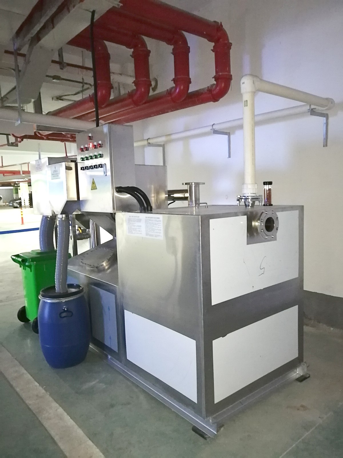 全自动油水分离提升一体化设备,具备杂物分离、油水分离和污水提升三个主要功能区。餐饮含油废水由进水口进入除渣集泥排泥区,废水所含固态残渣由除渣机自动隔离排放至残渣收集桶内,污泥经过箱体锥形底部收集。含油废水流到油水分离区,经过水流导向装置、平流物理分层、辅以恒温加热装置,促使油脂上浮至锥形集油区,集油区内设有自动收油装置,该装置会定时将废油脂排入集油桶内。污水进入提升区,当提升箱内液位达到设定值时,提升泵自动工作,将箱内污水提升至市政污水管网。